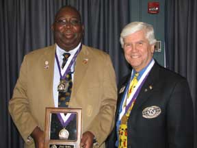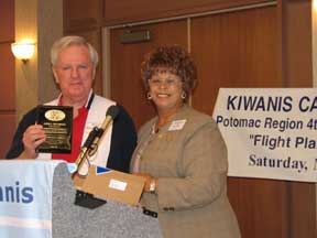 | Immediate Past Governor Art Riley presents the 2007-2008 Distinguished Club Award to Immediate Past President Nell Reid for the Kiwanis Club of Leisure World at the Potomac Mid-Winter Conference. This is a high honor to a well organized and well led Club. Well done to all! | ![]() |
