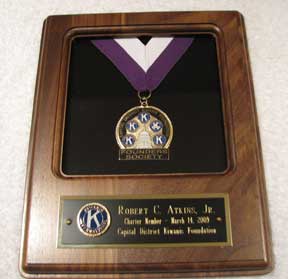 | The Founder's Society plaque, medallion ribbon and lapel pin is a great way to show appreciation of a dedicated Kiwanian. This award's engraving says: "Robert C. Atkins, Jr., Charter Member - March 14, 2009, Capital District Kiwanis Foundation". The medallion states "Founder's Society" with five "K's" of the Kiwanis Family in the design. The $1,000 tax exempt donation to the CDKF goes to the Service Leadership Program's support in our own District exclusively. Contact your CDKF division trustee for details on how to present an Founder's Society award to a deserving person in your club. | ![]() |