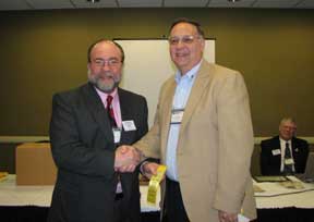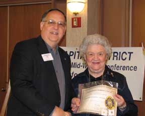 | Training, education and workshops are the main focus of the M-W's allowing leaders to take a mid-year look at where they stand and what is needed for the rest of the Kiwanis year. It's a good time, too, to present some awards for last year and to recognize people for their accomplishments. Trustee Doris presents the Kiwanis International Foundation Annual Gift award to LG John Buchanan of Division 22 in Southern Maryland for having 100% participation by all his clubs in 2007-2008. Good job, John! | ![]() |