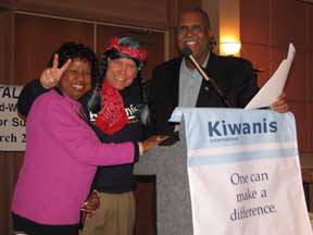 | Three Builder's Club representatives brought down the house during the Kiwanis Family Breakfast and Mid-Winter Opening Session. Articulate, entertaining, and personable - we were impressed with their poise, public speaking abilities and the exciting things they had to say. Flanked by Gov. Ganse (left) and CKI Dist. Administrator Jeff Wolff (right) are Deborah Ross, Maddie Guthrie, and Sri Medicherla. | ![]() |