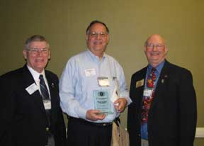 | Immediate Past Governor Art Riley is presented with the Kiwanis International Foundation Annual Birthday Gift Campaign Award by KIF Trustee Hugh Siggins, Capital District's KIF representative to Kiwanis International. Art inspired his team to give an average of over $5.00 per member to KIF. Well done! Hugh is a past governor of the Pennsylvania District and now a member of the Williamsburg, Virginia, Club. He is also the new CDK New Club Building administrative resource to help build clubs. On the left is Jim Jacobs, Mason Dixon's Capital District Trustee. | ![]() |