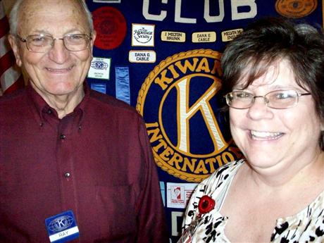 Ann Burnside Love was a recent speaker to the Kiwanis Club of Frederick. She spoke to the group about her recent knee surgery and how she has managed with walking. Mrs. Love then talked about what she called an adventure with her family when she attended the musical production of "Les Misérables in Concert" with her wheel chair, walker, and ice, in her determination to not let knee surgery curtail her good time. Kiwanian Ray Ediger is with the speaker.