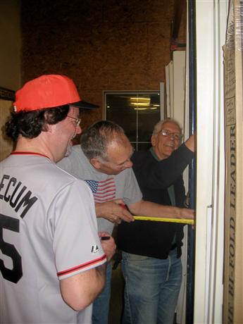 Members (from left, Philip Day, Dick Lear, and LTG Herb Ely) apply their exacting measurement skills to the large inventory of door units, dry wall, and other building modules.