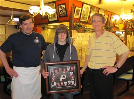 The newly formed KIWANIS Club of Fort Eustis held its first "Pancake Palooza" fund raiser on February 28th at the Belgian Waffle and Steak House in Newport News. Bradley Smith of Williamsburg won the drawing for an autographed Redskins photo presented by David Wells, club President, and Chris Christou, restaurant owner. Proceeds from the event will benefit the children of Fort Eustis and its surrounding area.