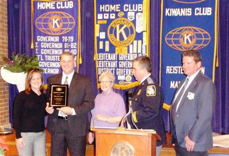 The Kiwanis Club of Reisterstown had it's Annual Policeman of the Year Award Dinner on Tuesday February 8, 2011. Officer Sean Lawlor, an eight year veteran of the Baltimore County Police Department was this year's recipient. He has served in the Pikesville and Franklin precincts throughtout his years in the department. Officer Lawlor is married and a member of the Marine Corp Reserve and has served 2 tours in Iraq. Pictured from left to right; Mrs. Lawlor, Officer Sean Lawlor, Community Service Chair Jan Dudey, Capt. Matt McElwee, President Jerry DeBar.