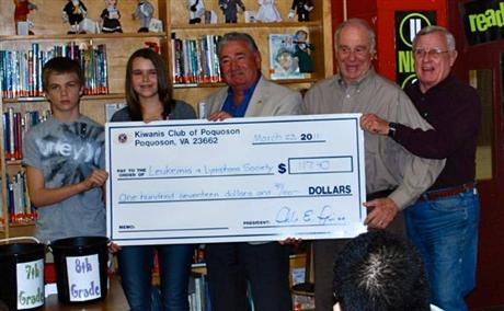 The Builders Club of Poquoson Middle School collected more than $170 for the Lymphoma & Leukemia society in their local campaign "Pennies for Patients." The Builders Club comprises Seventh and Eighth graders from the Middle School who meet monthly and participate both in their own charitable fund raising and in support of the sponsoring Kiwanis Club of Poquoson. Pictured left to right: Chase Lynch, President; Marisa Bocklet, Vice-President; Philip E. Prisco, Kiwanis Club President; Richmond Long and Brian Wilson, Builders Club advisors.