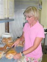Judy Kay Schroer, a member of the Kiwanis Club of Old Town (Winchester,VA) prepares sandwiches for the people coming for lunch at the Salvation Army Shelter. The club supplies twenty eight servers each month to provide help for the Tuesday, Wednesday and Friday lunch provided by the Salvation Army.