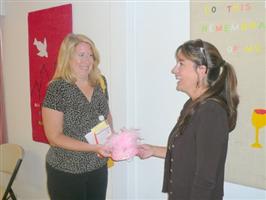Lorie Crabill (right) Chairperson of the Membership Growth Committee of the Kiwanis Club of Strasburg, (VA) presents the "Pink Hat" to fellow Kiwanian Laura Cadden. The Club project requires the receiver to wear the "Pink Hat" at each club meeting until they bring in a new member. The members, especially the men, are lining up new prospective members in advance of alphabetically being selected to receive "The Pink Hat".