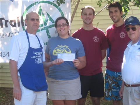 The 27th running of the Kiwanis Independence Day 5K race was a big success. More than $4,000 will go directly to support the efforts of Camp Holiday Trails, a unique camp for children with special health needs. This year's race attracted 189 participants, who ranged in age from 5 up to 84. The top male runner, Andrew Parkins, finished with a time of 16:45, while Carmia Steyn led the women with a time of 18:52. The Charlottesville Track Club, represented by Carol Finch and Jay Wilderman, once again organized a very professional race and tabulated and published results within minutes of the finish. Special thanks go to the major race sponsor, Better Living Inc., and to more than two dozen other businesses who provided monetary and in-kind support for this Charlottesville summer holiday tradition. Kiwanis also salutes Marc Lorenzoni of Ragged Mountain Running Shop, who has guided Kiwanis in this endeavor which has raised nearly $100,000 in the past quarter century for local agencies serving children and youth. Pictured above is Kiwanians Bill Hall (Race Director) (at left) and Don Foss (Current President) flanking representatives from Camp Holiday Trails for the check presentation.