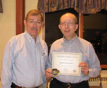 On November 18, 2008 the Kiwanis Club of Reisterstown was awarded the Distinguished Club Award for 2006-07. Governor Elect Don Dudey presented the award to Ed Guy, who was the club President for those years. The Distinguished Club Award is given to a Kiwanis Club which has met services and leadership programs requirements set by Kiwanis International. These include fulfillment of its responsibilities to Service Leadership Program clubs (K-Kids, Builders Club, Key Club, Circle K, Aktion Club, or Kiwanis Junior), which includes providing club leadership education to club officers and the Kiwanis club participates in a Kiwanis-branded service project, such as Young Children: Priority One, Read Around the World, Bring Up Grades, Terrific Kids, Key Leader. Pictured is Governor Elect Don Dudey with Ed Guy.