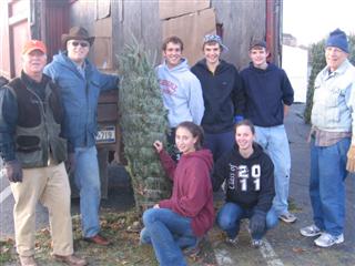 (Right, K-Family members moments after having unloaded 400 trees on the Friday morning after Thanksgiving. Kiwanians Marc Bridenhagen, Gordon Merrick, and Herb Ely are joined by Key Clubbers from Albemarle and Monticello High Schools.)