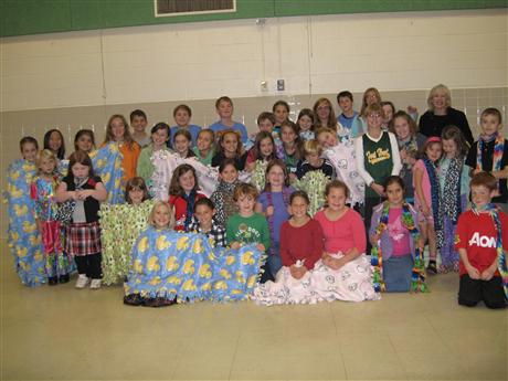 Family clients of New Hope Housing will be warmer this winter, thanks to the efforts of Stratford Landing Elementary School's K-Kids Club. Its 40 members gathered on November 17 and went into production mode to make 10 fleece baby blankets and nearly 50 fleece scarves. Chris Bramante (pictured, top right), community outreach and volunteer coordinator for New Hope Housing came to the club meeting to talk to the club members and pick up the blankets and scarves. This K-Kids community service club is sponsored by the Mount Vernon Kiwanis Club.