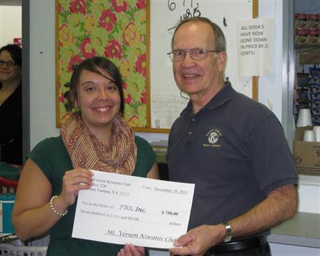 On November 14, Mount Vernon Kiwanis Club (MVKC) member, Bob Valone, presented a check for $750 to Lisa Vitale, Program Director for Psychiatric Rehabilitation Services, (PRS) a day center in Sacramento Plaza. This contribution will partly fund a workforce training teacher, formerly funded by the county. MVKC also provides a bingo game or karaoke event almost monthly for PRS clients. Pictured: Bob Valone of the Mount Vernon Kiwanis Club, presents Lisa Vitale, Program Manager of Psychiatric Rehabilitation Services with a check for $750.