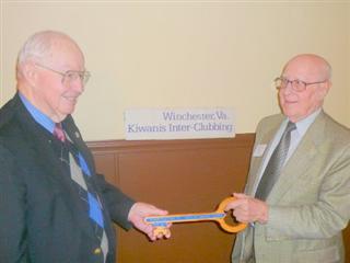(Above) Earl Zook, (right) of the Kiwanis Club of Winchester presents the Kiwanis Inter-Club Fellowship Key to Staunton (VA) Inter-Club Chairman Bill Atkins during the January visit to the Staunton Club located 80 miles from Winchester.