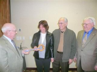 (Above) Debbi Matthews, Frank Parker and Ellis Stroup of the Kiwanis Club of Suburban Frederick, (MD) Kiwanis Club returned the Inter-Club Fellowship Key to Kiwanis Club of Winchester (VA) Inter-Club Chairman Earl Zook on a visit to the Winchester Club.