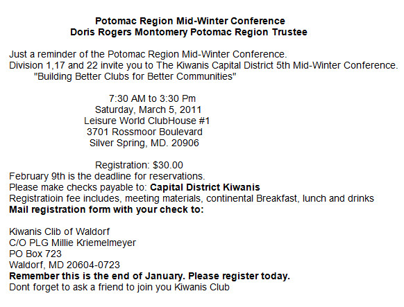 Gov. Tom's Messageby Gov. Tom Varner This was a great start to an even better year coming up in Kiwanis. Our member ship is on the rebound after the initial hit in October from clubs purging their roles, and we are down 52 members from the beginning. With a new club organized - Kiwanis Club of Tidewater Young Professionals on January 20 with 27 new Kiwanians, we should be down about 25 at the end of this month......more |