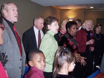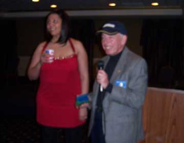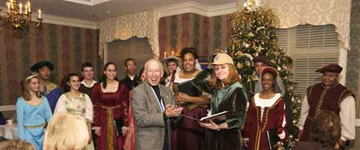 Bruce Malkin having presented the official cap of the Mount Vernon Kiwanis Club to choirmistress Judy Belzer for bringing the Mount Vernon High School Madrigal Chorale to our Xmas Party on December 17th. |