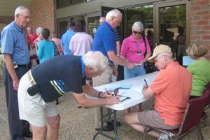 IMG 5653 - Attendees at the picnic sign-in with Jack Kruger of the Tabb Club and pick up an icebreaker game card to help them meet other Kiwanians from the area.