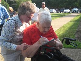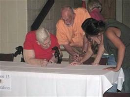 IMG 5654 - Joe Kalista of the Mercury 64 Club signs the icebreaker game card for Penny McClellan of Williamsburg Kiwanis.
