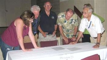 IMG 5652 - Members of Division 23 Clubs work together to solve the puzzles of a Kiwanis Trivia Contest during the picnic dinner.