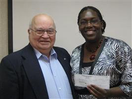 (Above) The Kiwanis Club of the Peninsula at Oyster Point supported the traffic awareness project which is aimed at making teenage drivers know what happens when drinking and driving turn into tragedy.  A staged "accident" occurs near the high school and actors portray the reactions or family members and friends.  It is a stark reminder of how a careless act can affect many lives.  The Kiwanis Club of the Peninsula at Oyster Point made a donation of $200 to this project.  MaRhonda Echols, right, victim's assistance advocate in the office of the Commonwealth's Attorney received the check from Chuck Root, Community Service chairman.