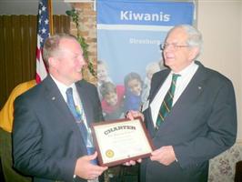 (Above) Kiwanis Club of Strasburg: Todd Drunagel (left) President of the sponsoring Kiwanis Club of Old Town, (Winchester, VA) presents the Charter of Organization to President Steven A. Schetrom II for the Kiwanis Club of Strasburg (VA) in June. The Club meets each Tuesday morning, 7:30 a.m. at the Strasburg United Methodist Church.