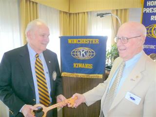 (Above) Darwin King of the Staunton (VA) club returns the Kiwanis Inter-Club Fellowship Key to Inter-Club Chairman Earl Zook of the Kiwanis Club of Winchester (VA) on a return visit scheduled by the Club.