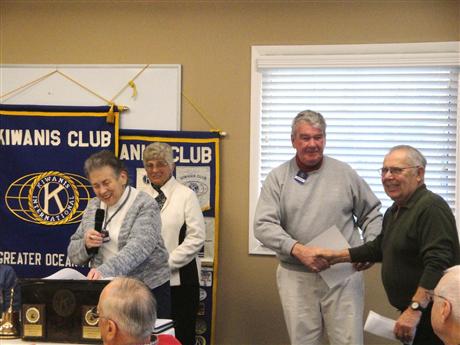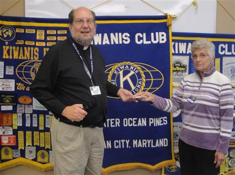 Kiwanis Supports Interfaith Caregivers. Pictured is Reverend David Herr, Human and Spiritual Affairs Chair for the Kiwanis Club of Greater Ocean Pines - Ocean City and leader of Worcester County Interfaith Caregivers, as he accepts a check for $400 from Kiwanis Club V.P. Barbara Peletier. Interfaith Caregivers has been in existence for almost 20 years and is manned by volunteers who offer their time and cars to drive individuals in need of transportation to and from medical appointments. Reverend Herr stated that most of the people now go to AGH and nearby health providers in Berlin, MD as opposed to earlier times when it was necessary to drive to Salisbury where those services were available. For more information or to volunteer to be a driver, contact Reverend Herr at 410-352-5382.