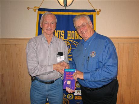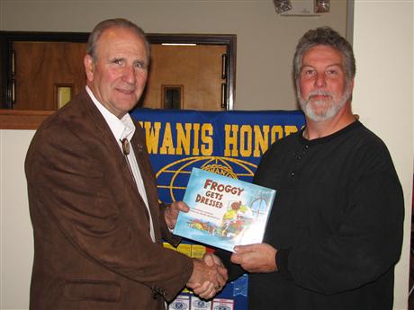 Kiwanis Club of Suburban Frederick member Robert Wilson, a member of the Board of Directors of the William F. Moran, Jr. Museum & Foundation, Inc., recently invited Foundation President and bladesmith E. Jay Hendrickson to speak to the club about the well-known knife maker, Bill Moran (deceased) formerly of Middletown, MD. Jay told stories about Bill’s early years, how he began making knives, how he rediscovered the secret of making Damascus steel, and how he became one of the most famous bladesmiths in the world. Jay also brought examples of Bill Moran’s work including a Damascus steel knife. Pictured (L to R), Wilson presents Hendrickson with a child’s book as a “Thank You” gift. The book, part of the club’s Read Around the World program, will be donated to the C. Burr Artz Public Library in the name of Kristen and the Moran Foundation.