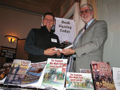 Noted Civil War expert and author Bob O'Connor recently spoke to the Kiwanis Club of Suburban Frederick about Frederick County during the Civil War. A prolific writer, O'Connor brought along examples of several of his recent writings. But he is constantly on the look-out for other Civil War-related material as well. O'Connor (right) shows club member Bill Muffi a little-known early 20th-century book about Lincoln's bodyguards that O'Connor discovered and recently obtained the rights to re-publish.