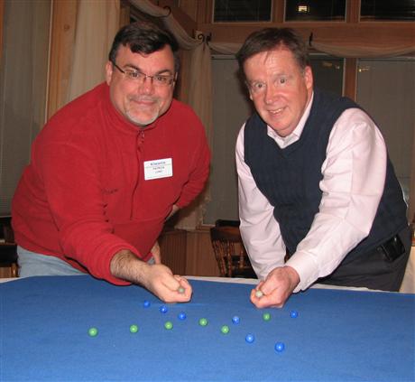 Shooting marbles has been a local tradition for over 20 years, thanks to the help of Art Staus, director of the Frederick County Knucklers, a competitive marble-shooting club. Staus recently visited the Kiwanis Club of Suburban Frederick to explain the history of shooting marbles in Frederick County and his efforts to expand the program locally. Pictured, left to right, novice marble shooter and club member Patrick Long gets much-needed marble shooting tips from Staus.