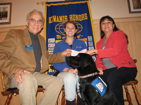 Guide dog Macallan recently visited the Kiwanis Club of Suburban Frederick. Joined by her trainers Becky Little and Janelle Little, Macallan demonstrated services that he will one day provide a sight-impaired person. Becky Little, Catoctin Region coordinator for Guiding Eyes for the Blind, explained the history and operation of Guiding Eyes for the Blind, the national organization that breeds and trains guide dogs, and Janelle Little put Macallan through his paces to the delight of club members. Club member Frank Parker presented the Littles with a $500 check in support of Guiding Eyes for the Blind program. Pictured (L to R) Frank Parker, Janelle Little, Macallan, Becky Little.