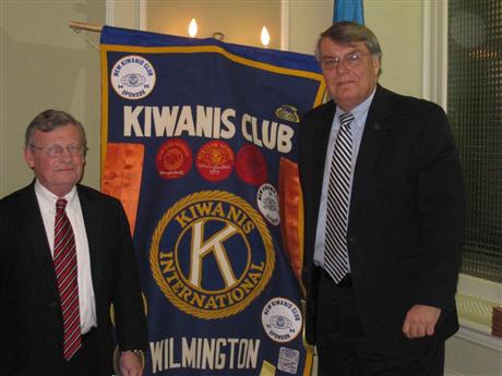 Wilmington Kiwanis President, City Solicitor, John Sheridan (L) stands with club meeting speaker, 27 year City Treasurer and current Mayoral candidate, Andrew Sipinski after Mr Sipinski had detailed the functions of the Treasurer's department at a recent February club meeting.
