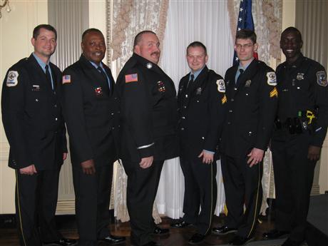 WILMINGTON KIWANIS HONORS POLICE, FIRE & EMS AWARD WINNERS FOR 2011 AT ANNUAL AWARDS DINNER AT THE HOTEL DuPONT. THIS IS REALLY GREAT TEAMWORK! All teams assisted each other in a December fire in Wilmington where Police determined and located 2 babies caught inside the flaming home. Fire fighters entered the burning, smoke filled 2 second floor on their stomachs in search of the exact locations of the children and brought them out unconscious but not breathing and began CPR. EMS took over the still unconscious children, continued CPR, administered oxygen brought them back to breathing and rushed them to separate hospitals where both survived and are now out of the hospitall after one monthl! Left to right: EMS Matthew H. Heiger, Fire Fighters Cornelius Skinner and Lt. Eric Haley, EMS Cpls Isaac Hankins and Robert Sullivan, and Police Patrolman Ahmard Reddick. Well done! The Wilmington Kiwanis recognizes and thanks you as the Best of 2011 !