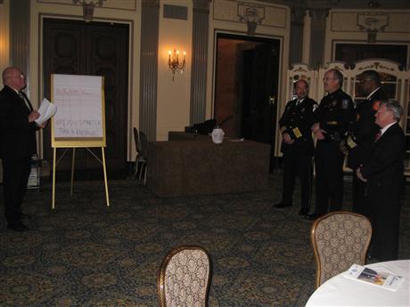 WILMINGTON KIWANIS HAS FUN! "ARE YOU SMARTER THAN A KIWANIAN?" CONTEST. DOC OConnell, Wilmington Kiwanian issues the "difficult" questions to EMS Chief Lawrence Tan, Police Chief Michael Szczerba, Fire Chief Willie Patrick and Kiwanis President John Sheridan. EMS, Police & Fire questions included: "What country makes Panama hats?" (answer, Ecuador....). "Where are Chinese gooseberries from?"(answer New Zealand....). "From which animal do we get cat gut?"(answer sheep....). Kiwanis President, John Sheridan, had the most difficult questions of the evening posed to him. "What is your brother's last name?"(answer Sheridan, and President John got "bonus points" for answering so rapidly....) Shown from L to R are Kiwanian DOC OConnell, EMS Chief Lawrence Tan, Kiwanian Police Chief Michael Szczerba, and Kiwanian Fire Chief Willie Patrick. PS. Wilmington Kiwanians won for the 76th "straight" year.... Wilmington Kiwanians have fun!