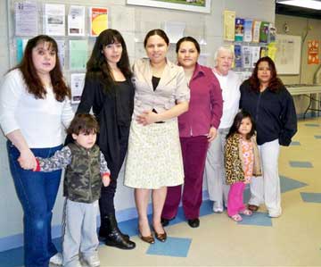 The Creekside Neighborhood Center in Janna Lee is a UCM-supported after-school Center that Mount Vernon Kiwanis Club also helps in various ways, including trips, camps, and karaoke. In the middle of the photo, in the white skirt and vest, is Blanca Vasquez, one of the two Co-Directors of this Center. She has just received a donation from Mount Vernon Kiwanis Club President, Bruce Malkin, for the purchase of educational videos for use by the children on the computers at the Center and for supplies for the Easter Party planned for next week.
