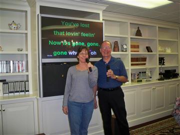 On April 16, Mount Vernon Kiwanis Club member Bob Valone led the senior residents of Paul Spring Retirement Community in a sing-along of old and familiar songs.  He presented a wide range of musical genres, and the residents appreciated the musical diversity by singing the words as they flashed on the big-screen TV.  This program was developed in conjunction with Ms. Darnall Graham, the Program Directer of Paul Spring Retirement Community on Fort Hunt Road.  In above photo, Bob Valone and Darnall Graham in front of the big-screen TV, where the words of each song were displayed to make the sing-along easier for the residents to join in.  Bob leads karaoke singing at a number of area locations for his club, including Psychiatric Rehabilitation Services, Mondloch House, and Creekside and Sacramento Neighborhood Centers.
