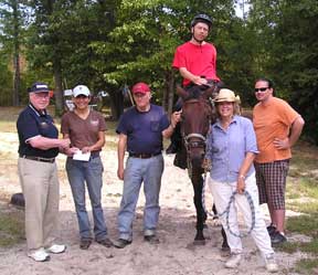 For Children Kiwanis donated $250 to 4STEPS which is a 501c3 non-profit organization committed to enriching the lives of children and adults with challenges through safe, therapeutic interaction with horses. They are located in Parsonsburg, MD. and can be reached by telephone at 410-835-8814 for follow-up or additional information. The mission of Kiwanis is "Serving the Children of the World". Pictured accepting the check is Sandy Winter from 4STEPS. Left to right: Ed Schaefer, President of the Kiwanis Club of greater Ocean Pines - Ocean City, Sandy Winter, Dick Warren, Gina Krall, and Robbie Richardson. Seated on the horse is Patrick Bounds. The horse's name is "Walker". |