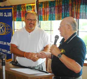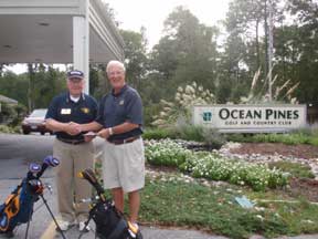 To Junior Golf In Ocean Pines Pictured is Kiwanis Club of Greater Ocean Pines - Ocean City President, Ed Schaefer, with Bill Hickey, Vice President of the Board of Golf Governors and chairman of the Jr. Golf Tournament (which is sponsored by the Board of Golf Governors) making a presentation of a check from Kiwanis to support the Jr. Golf Tournament. |