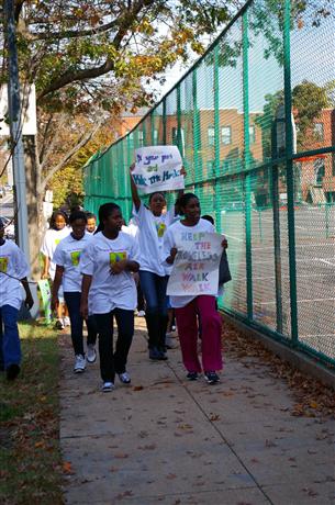 The Builders Club of Stuart Hobson Middle School, sponsored by the Kiwanis Club of Capitol Hill, supported several initiatives of community service on Thursday, October 28th, 2010. The core focus was participation by all students in the Walk for the Homeless sponsored by Fannie Mae. Students and teachers showed support as well for First Lady Michelle Obama's campaign to rein in childhood obesity through the Let's Get Going Campaign and the Healthy Eating Campaign. The Builders Club sponsored a water table for walkers that featured water and healthy snacks, including granola bars and fruit. Many of the students extended their walk for the homeless by walking an additional 3 ½ miles carrying cans of food to replicate the experience of much of third world countries that do not have adequate clean water. All this on one glorious sunny day! The Builders Club at SHMS is led by teacher Lesa Warrick and had the support on that special day of Kiwanians Jan MacKinnon and Sandra Jenkins as well as Capitol Hill President Marilyn Franklin.