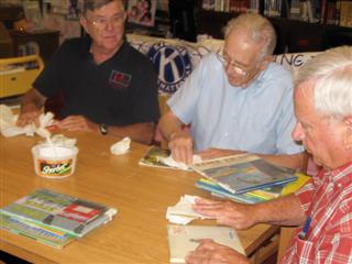 Participating in one of their most favorite "Service Nights," 18 Charlottesville Kiwanians cleaned and refurbished approximately 1,000 well-used but soiled children books at the Jefferson-Madison Regional Library. "The Kiwanians always do such a tremendous job that we asked them to come back again at their earliest opportunity," said Karen Gillaspie, Children's Library Director. The Charlottesville Kiwanis Club meets at the Elk's Lodge every Monday evening except the fourth. The fourth Monday has been designated for the past ten years as "Service Night," where Kiwanians and K-Family members and spouses and friends and prospective members venture out to a local non-profit to enjoy two hours of service and fellowship. The fourth Monday in August saw the Kiwanians doing landscape work at the Ronald McDonald House. They also cheerfully shared the catered meal with several families who were staying at the facility adjacent to the University of Virginia Children's Hospital. And since there is a fifth Monday in August, Charlottesville Kiwanis has decided to head back over to Jefferson-Madison Regional Library to clean another thousand or so books and let the library put them in the hands of Charlottesville's eager young readers.