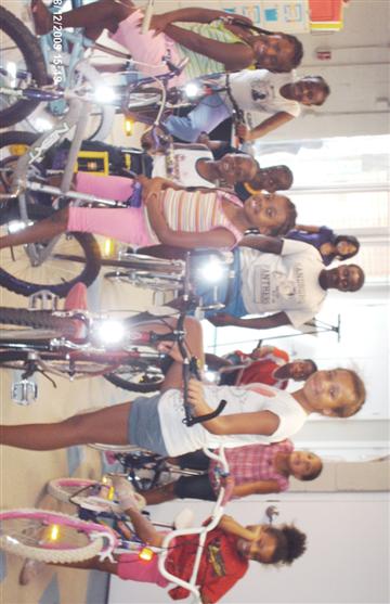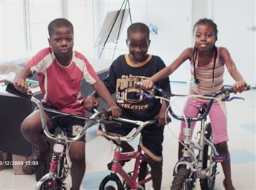 The below photos show Sandra Medrano, Richard Peterson, and Charles Jones outside the Creekside Neighborhood Center with some of the donated bikes as well as several of some of the children inside the Center with their new bikes.
